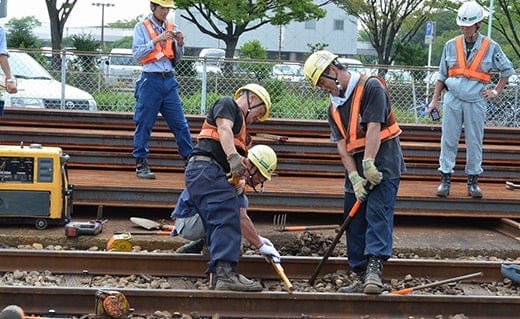 競技会では、協力会社が開発した冶具や新しい保線用機器を使った「マクラギ交換」のスムーズな施工や声掛け応答などを競い合った。