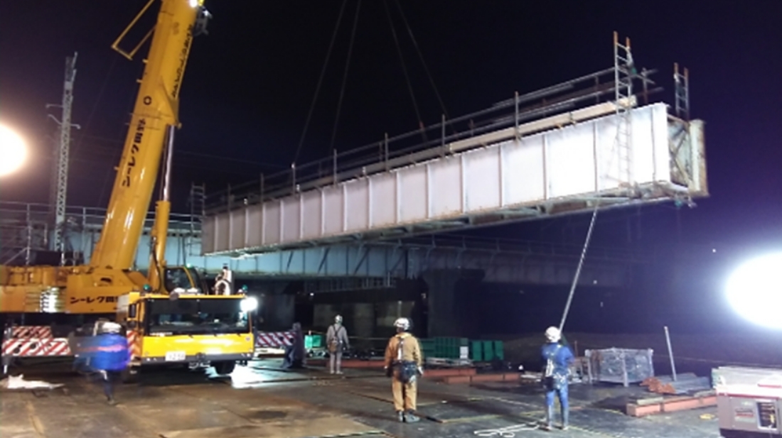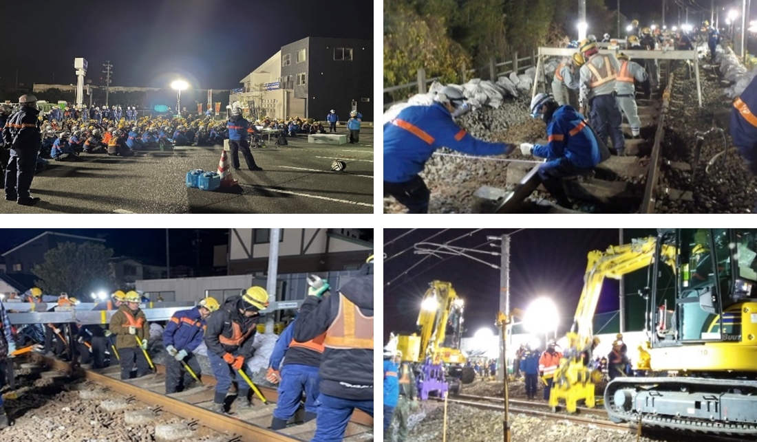 2023年1月21日夜間、半田高架仮線軌道への線路切替工事を行いました。当日はCN社員・軌道協力会社社員の総勢約260名が作業に従事しました。施工現場は急曲線と縦曲線が介在するなど難易度が高いうえ短時間で施工を行う必要がありましたが、入念な事前準備と役割分担を明確に行い、無事故無災害で完了しました。