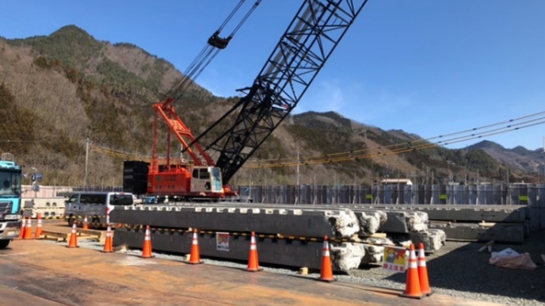2020年9月から名工建設㈱とのJVで行っていた山梨リニア実験線北線の旧ビーム式ガイドウェイ側壁撤去処分工事(延長8.4㎞)が2023年3月に完了しました。特殊制作車両や重量級クレーン(450t吊、200t吊)を用いた大掛かりな工事をリニア走行試験による作業時間等の制限の中、昼夜混合作業で2年半にわたり行いました。