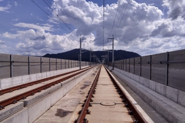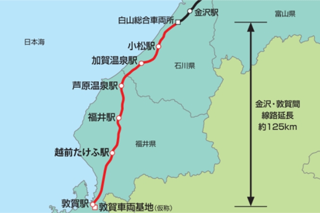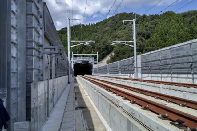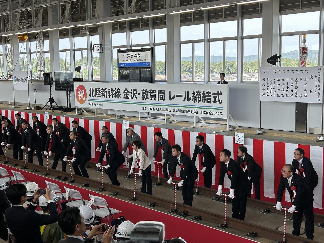 2020年4月より始まった金沢・敦賀間のレール敷設工事が完了しました。当社は鯖江地区の11.0kmの軌道敷設を行いました。2023年5月27日には福井県あわら市のJR芦原温泉駅にてレール締結式が行われ、現在は令和6年春の開業に向け、土木構造物・軌道・電車線・信号設備等の機能確認を目的として新幹線W7系車両、電気・軌道総合検測車(イーストアイ)を使用した走行試験が実施されています。