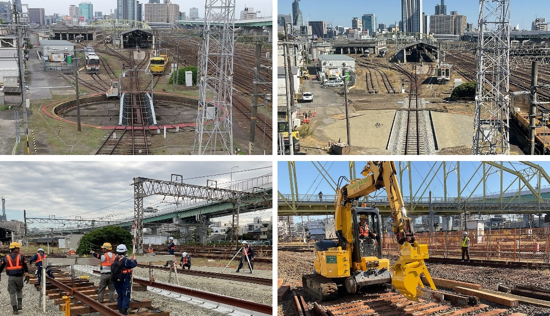 JR東海の名古屋車両区の検修庫建替え工事とそれに伴う研修庫線の改良工事について、当社は軌道関係の工事を実施しました。1935年に設置された転車台は2023年10月に撤去工事を行い、その跡地には延長50mの線路を新設しました。また同時期に研修庫線の線路撤去工事も行いました。