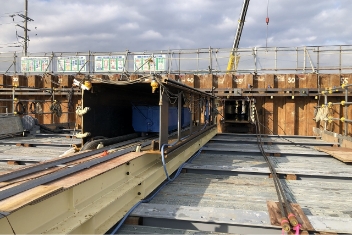 敷設した鋼製エレメントを横断構造物の本体とし、鋼製エレメントを到達側からけん引し、非開削で地中に敷設する施工方法です。貫入したエレメントをそのまま本体構造物として用いるため、貫入作業が1回で済み、軌道や路面に与える影響が少なく、工事を安全かつ効率的に行えるため短期間に完了させることができます。