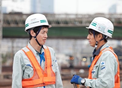 鉄道の技術は一般の学校では学ぶことができません。鉄道敷地内の工事は資格が必要であり、最低2年間の実務経験が必要です。そのため当社では特に入社3年目までの教育に力を入れています。入社後2か月間の集中研修では、社会人としてのビジネスマナーのほか、鉄道に関する基礎教育、体感型の実技訓練などを行います。その後は、JR東海の研修センターでの研修、鉄道実習線での研修など、入社3年目までを教育期間として徹底的に知識と技術を身につけます。また、入社後2年間は先輩社員が業務やメンタルの悩みを聞き、親身に相談に乗るメンター制度を導入。組織人としての成長を支援しています。その後は管理者育成研修、他社との合同研修など、成長し続けられる体制が整っています。