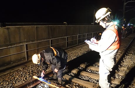 | 4:30 | 作業終了 列車を高速で運行させても問題がないよう、ミリ単位で施工状態の仕上がりを確認。最後に線路内に置き忘れが無いいように器具の確認と跡確認の実施。 |